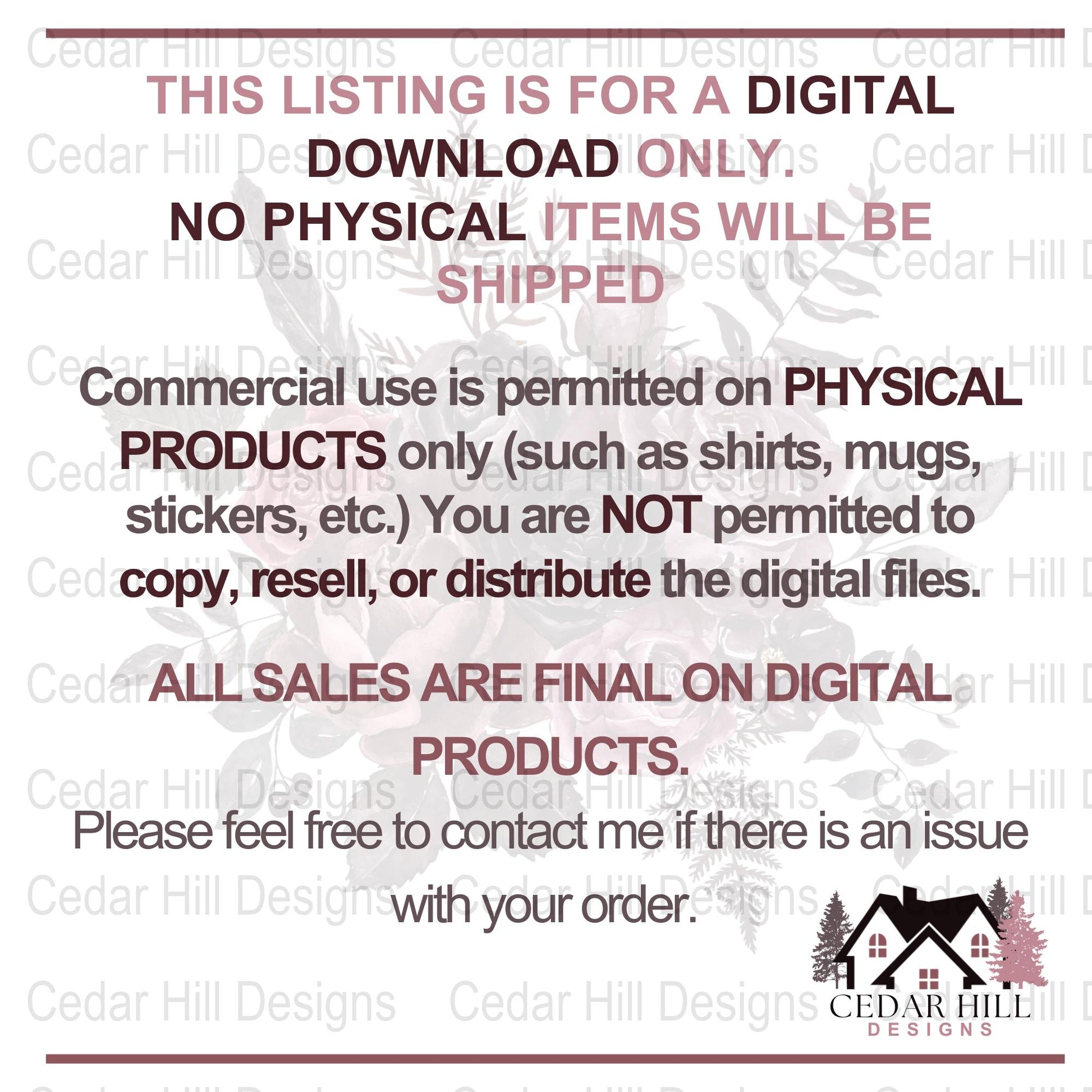**Commercial use permitted for physical end products ONLY (Such as, shirts, mugs, stickers, etc.). You are not permitted to copy, resell, or distribute digital files.