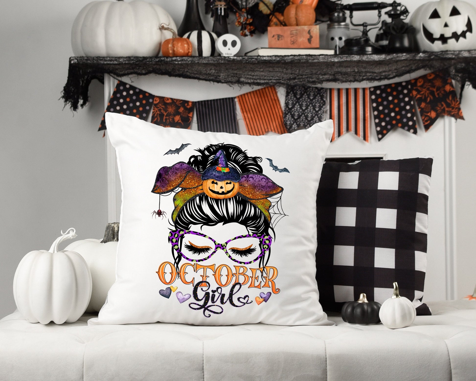 October girl messy bun. The perfect gift for anyone who loves all things Halloween! Celebrate the spooky season with this classic Halloween pillow cover. This pillow case is sure to become a favorite in the seasonal decor rotation.