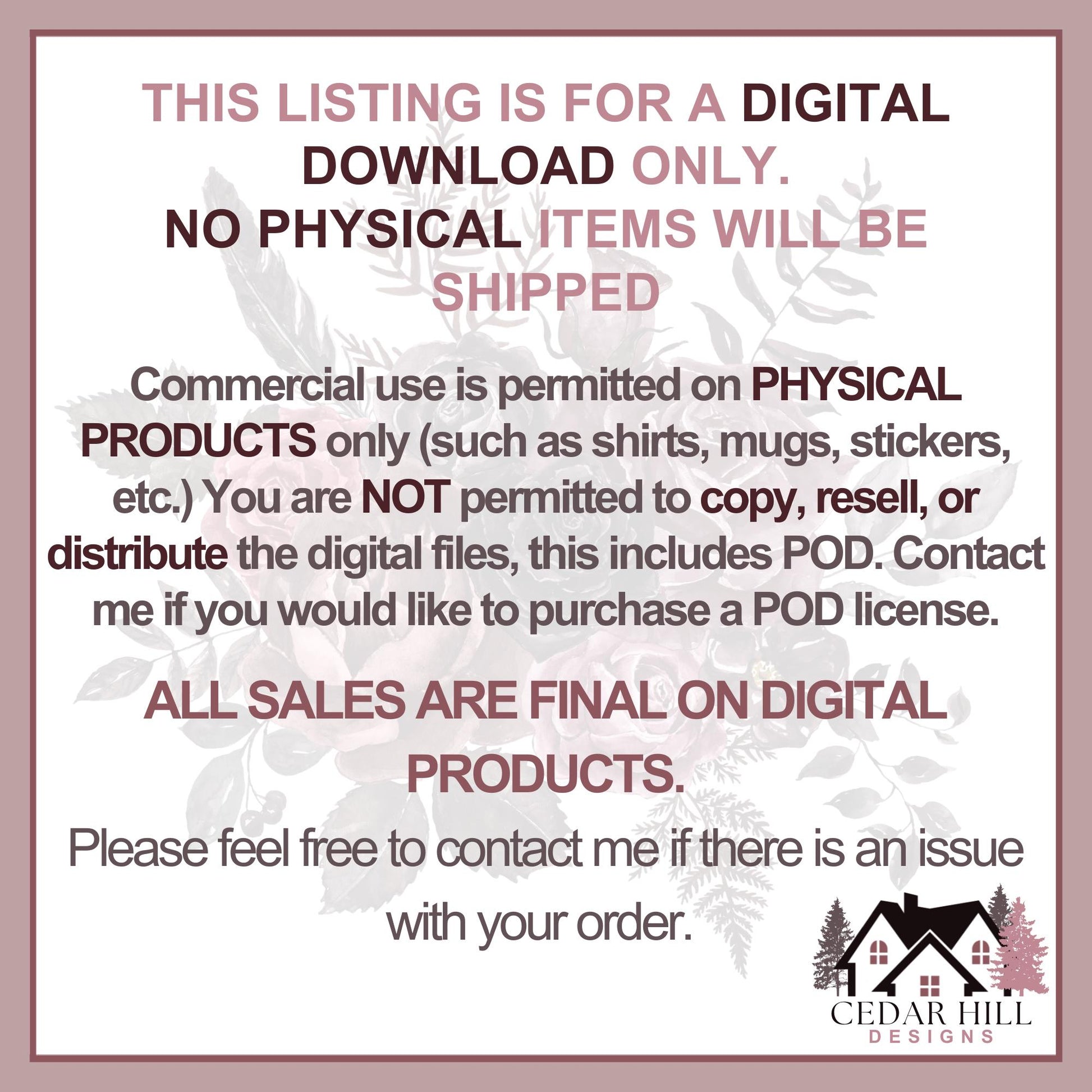 - For personal and commercial use. Commercial use is permitted on PHYSICAL END PRODUCTS only! (such as shirts, mugs, stickers, etc.) You are NOT permitted to copy, resell, or distribute the digital files, this includes POD. If you would like to purchase a POD license shoot me a message.